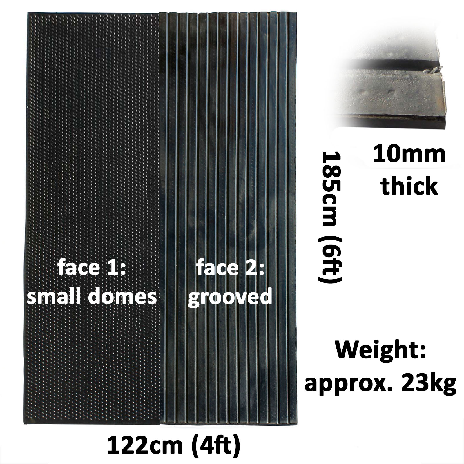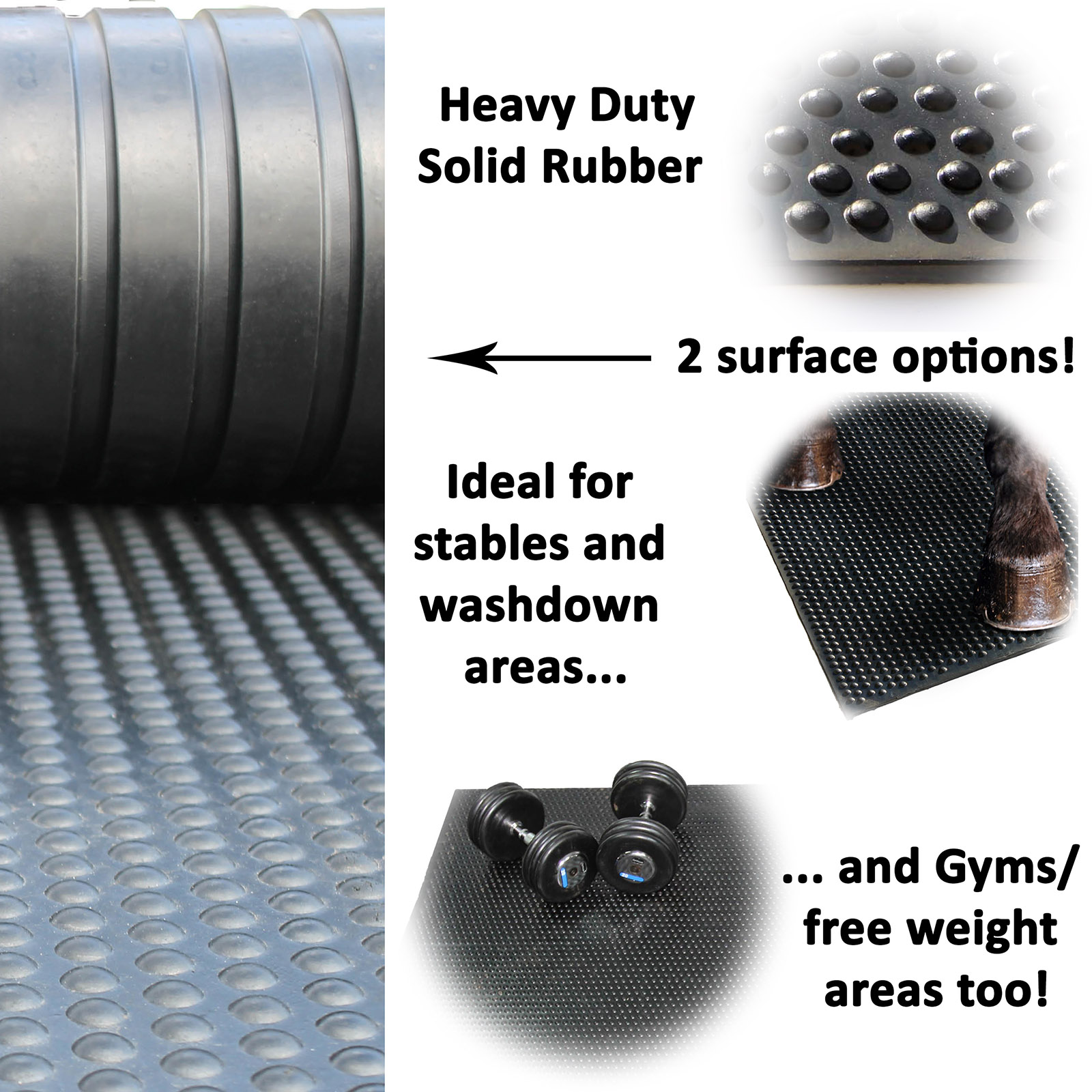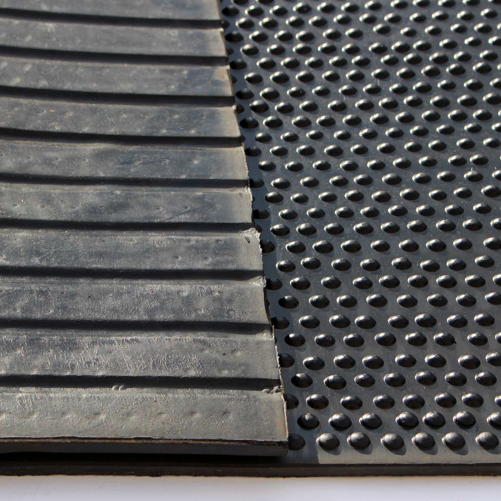 Made from heavy duty long lasting non porous rubber with a Bubble top surface and a wide rib drainage channel pattern on the bottom. These mats are ideal for wash down areas, stable flooring underneath bedding, flooring use beneath heavy items (tack rooms, gyms, workshops etc.). Completely waterproof, the mats can be easily washed off with a hose or pressure washer, or mopped clean using hot soapy water.