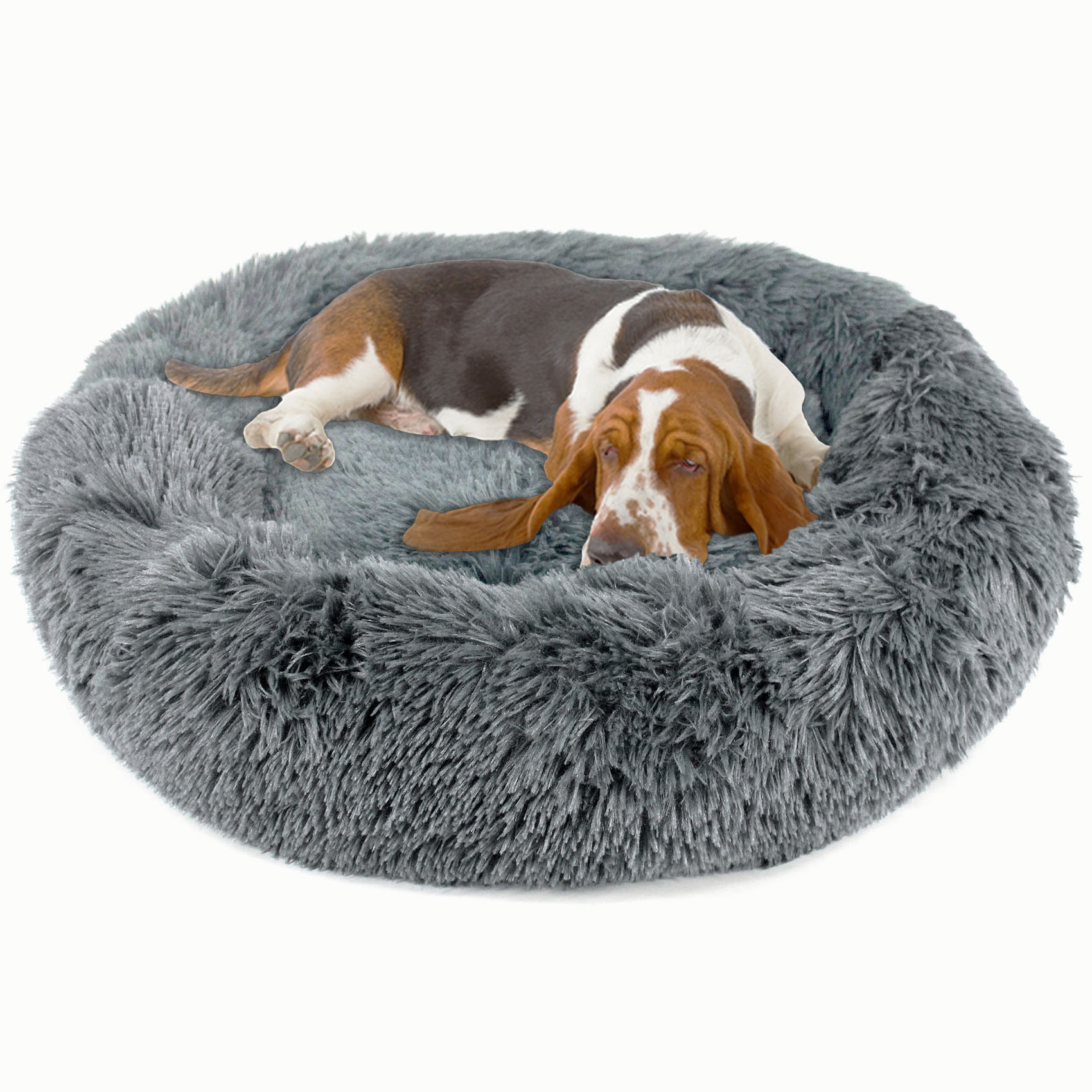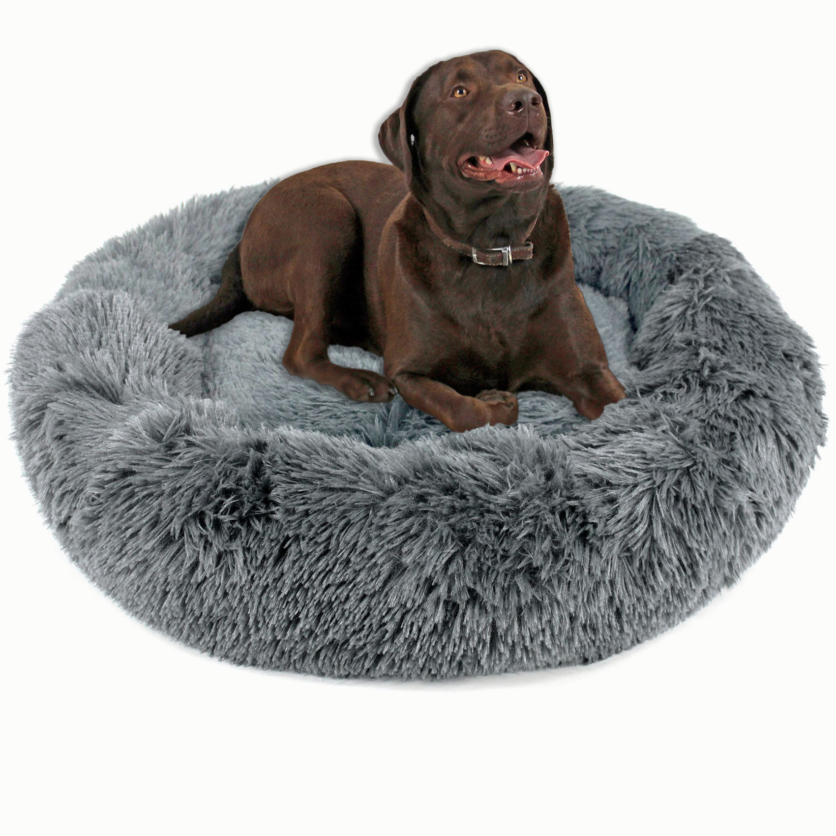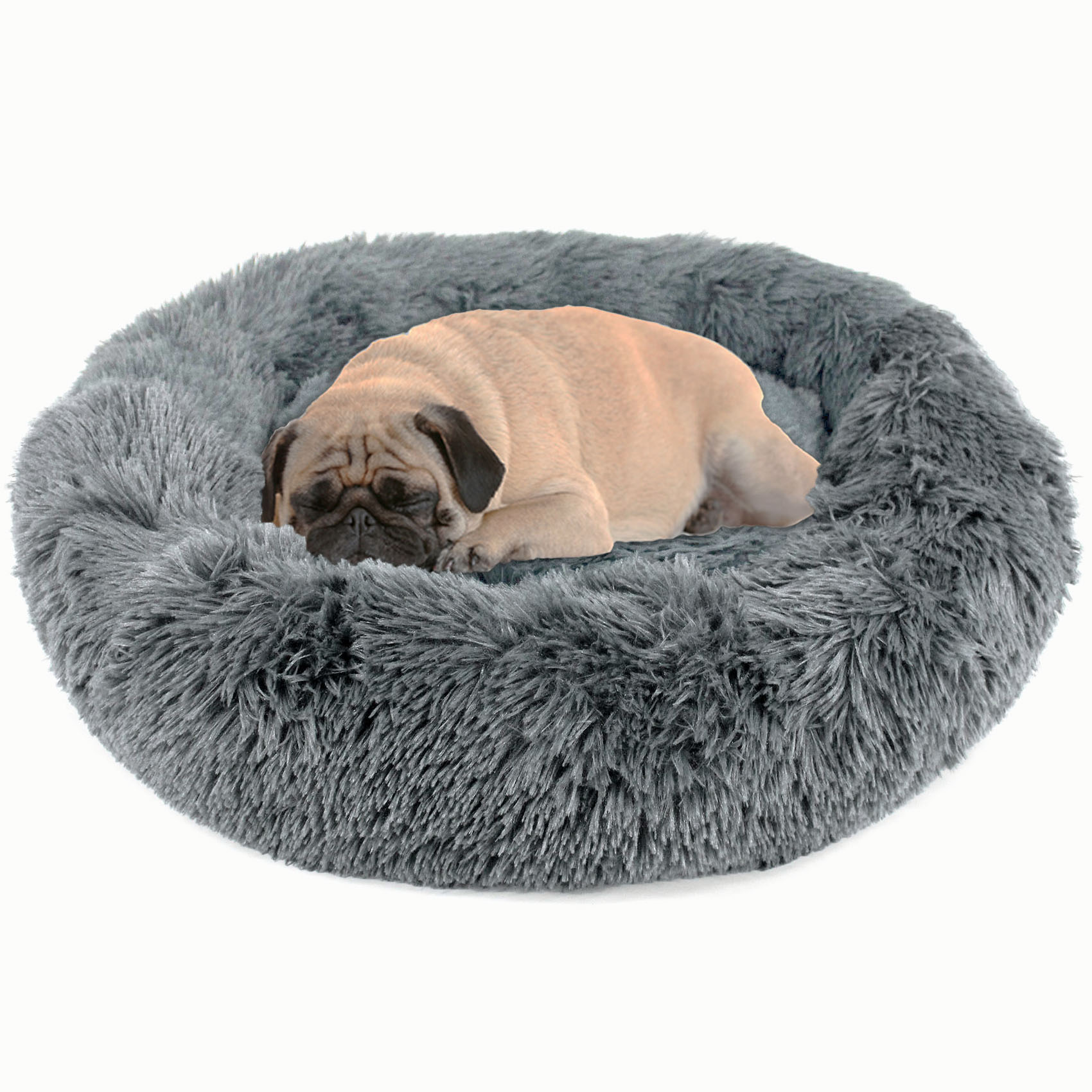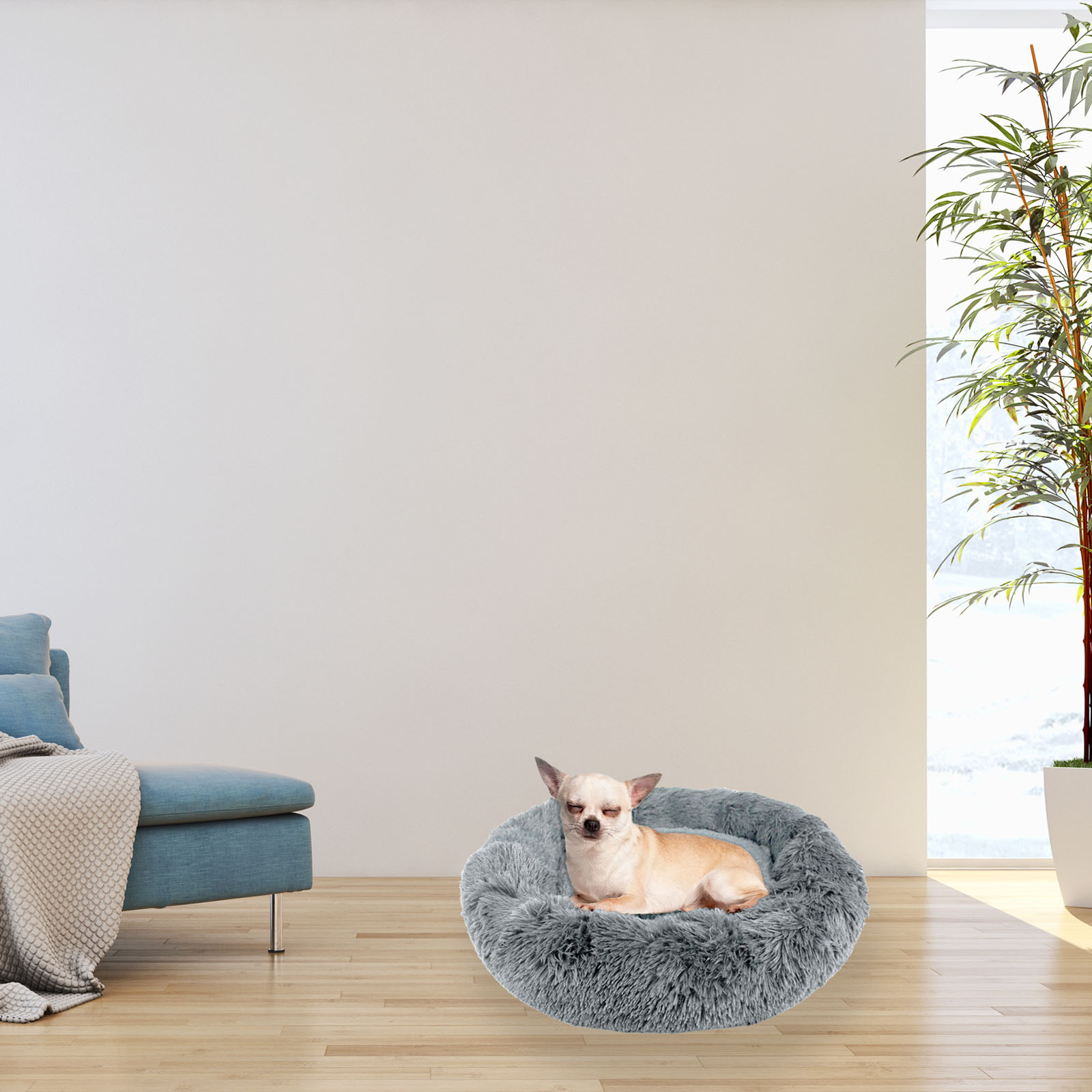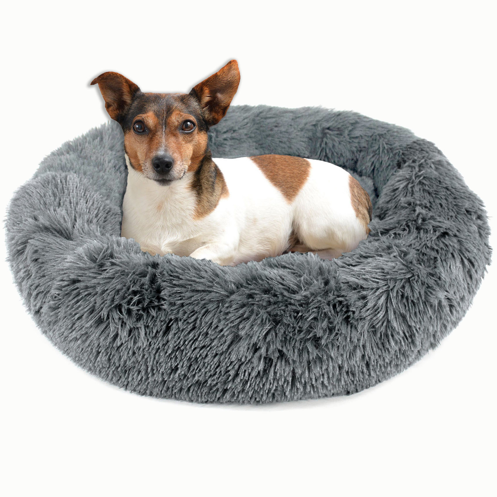 Our fluffy pet bed in a dark grey finish. It has an outer cover made from long hair fleece with a comfortable soft polyfiber filling. This fluffy pet bed is the perfect napping spot for your furry friends!